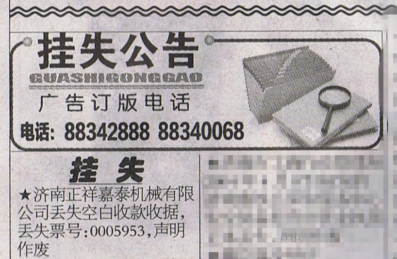 濟南正祥嘉泰機械有限公司 丟失空白收款收據,丟失票號:0005953,聲明作廢